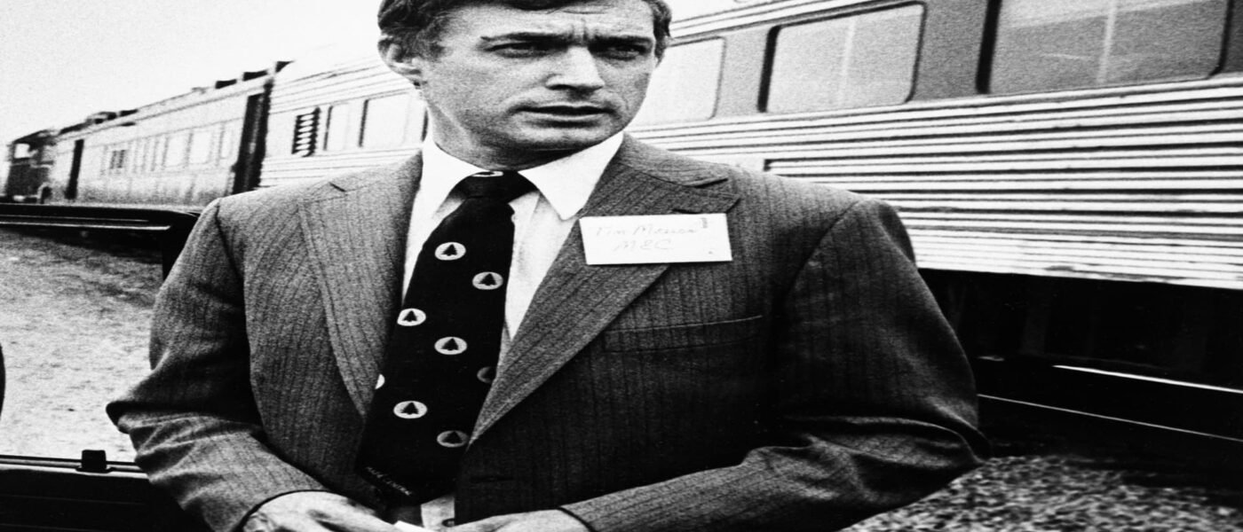 Timothy Mellon, visto afuera de un tren de inspección durante un recorrido por la propiedad en 1981. Se desconoce la fecha exacta y el lugar.