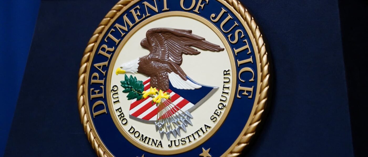 El sello del Departamento de Justicia de los Estados Unidos se ve en el podio en la sala de información de la sede del departamento.