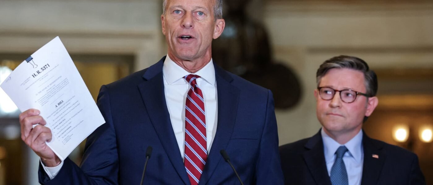 El líder de la mayoría del Senado de los Estados Unidos, John Thune (R-SD), sostiene una copia de la Ley de Asignaciones Continuas y Extensiones mientras habla junto al presidente de la Cámara de Representantes, Mike Johnson (R-LA), durante una conferencia de prensa el tercer día de un cierre parcial del gobierno federal en el Capitolio de los Estados Unidos en Washington, DC, Estados Unidos, el 3 de octubre de 2025.
