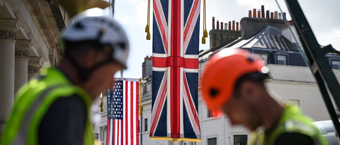 Las pancartas de EE. UU. Y el Reino Unido están instaladas por ingenieros de la consultoría de bandera en la calle afuera de Windsor Castle el 12 de septiembre de 2025 en Windsor, Inglaterra. El presidente de los Estados Unidos, Donald Trump, está haciendo una visita oficial de estado al Reino Unido del 17 al 19 de septiembre.