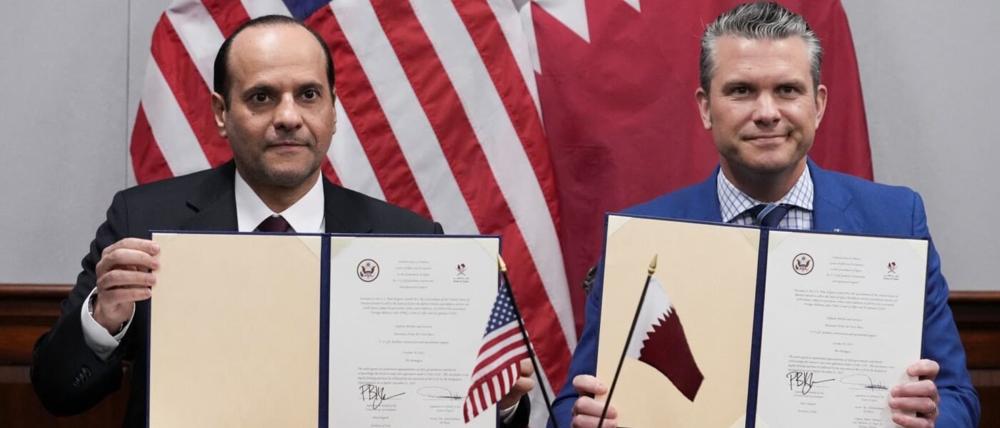 El secretario de Defensa de Estados Unidos, Pete Hegseth, y el viceprimer ministro y ministro de Defensa de Qatar, jeque Saoud bin Abdulrahman al-Thani, presentan un acuerdo firmado durante su reunión en el Pentágono en Washington, DC, Estados Unidos, el 10 de octubre de 2025.