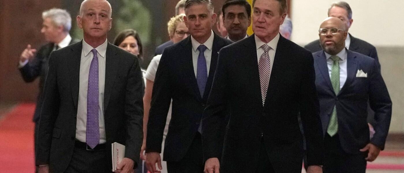 Los legisladores estadounidenses se dirigen a una reunión con el primer ministro chino Li Qiang en el Gran Salón de la gente de Beijing el 21 de septiembre de 2025.