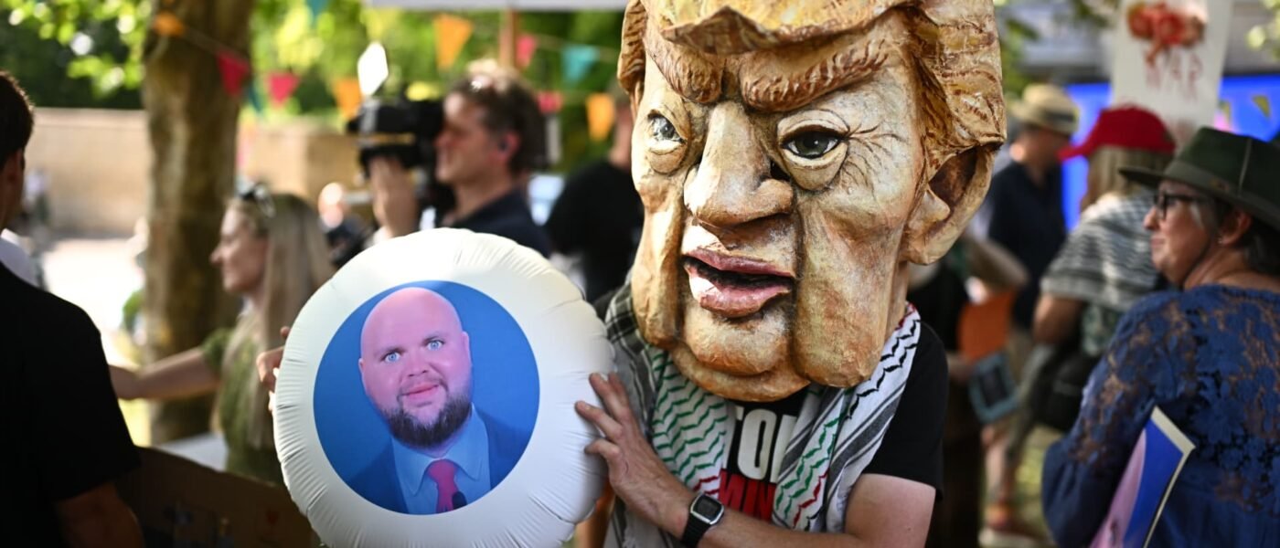 Un manifestante que usa una máscara satírica de la AA del presidente estadounidense Donald Trump, posee un globo que representa una imagen satírica del vicepresidente estadounidense JD Vance durante un «Vance no bienvenido», organizado por los partidarios de Stop Trump y residentes locales el 12 de agosto de 2025 en Charlbury, Oxfordshire.