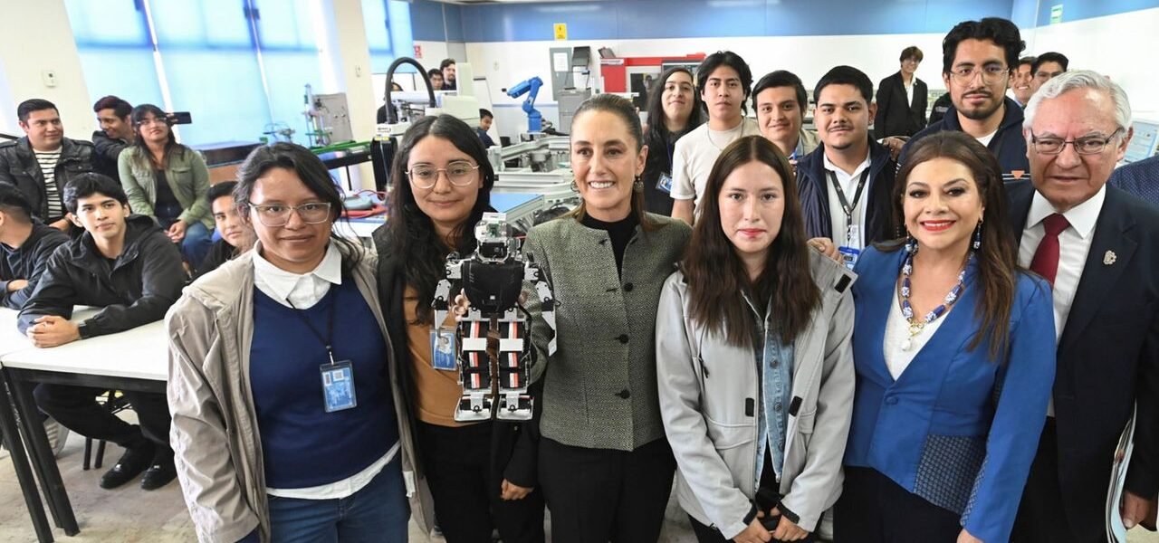 Claudia Sheinbaum, presidenta de México, y funcionarios del gobierno federal de México observan un sistema robótico en en las instalaciones del Tecnológico Nacional de México (TecNM), de la alcaldía Tláhuac.Cortesía Gobierno de México/Saúl López
