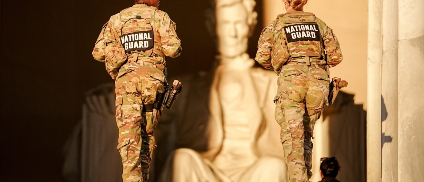 Soldados de la Guardia Nacional de Estados Unidos suben las escaleras hacia el Monumento a Lincoln temprano en la mañana.