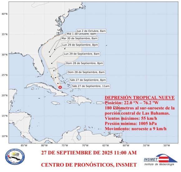 Un reporte de la entidad estatal señala que la extensa zona de bajas presiones asociada a una activa onda tropical, continuó ganando en organización e intensidad durante las últimas horas, convirtiéndose en la mañana de este 27 de septiembre en una depresión tropical.