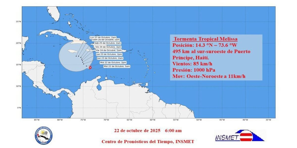 La tormenta tropical Melissa, con vientos máximos de 85 kilómetros por hora, podría afectar el oriente de Cuba en los próximos días, según el aviso de Ciclón Tropical No. 3 del Instituto de Meteorología (INSMET).