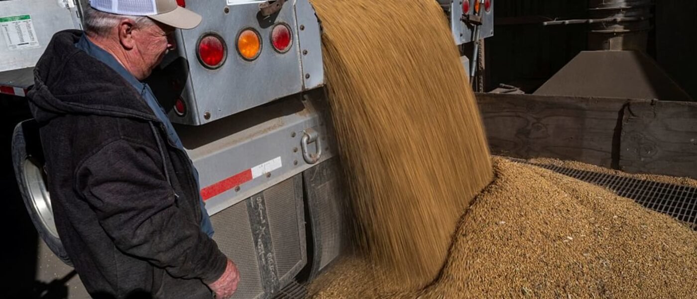 Travis Hutchison, un agricultor de soja, descarga su carga del camión de su familia en un comerciante de cereales local en Queen Anne, Maryland, el 10 de octubre de 2025.