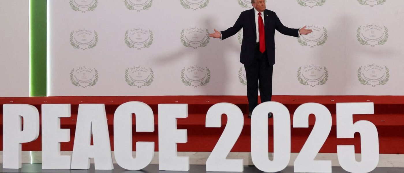 El presidente de Estados Unidos, Donald Trump, hace gestos mientras posa junto a un cartel antes de una fotografía familiar en una cumbre de líderes mundiales sobre el fin de la guerra de Gaza, en medio de un intercambio de prisioneros y rehenes negociado por Estados Unidos y un acuerdo de alto el fuego entre Israel y Hamás, en Sharm el-Sheikh, Egipto, el 13 de octubre de 2025.