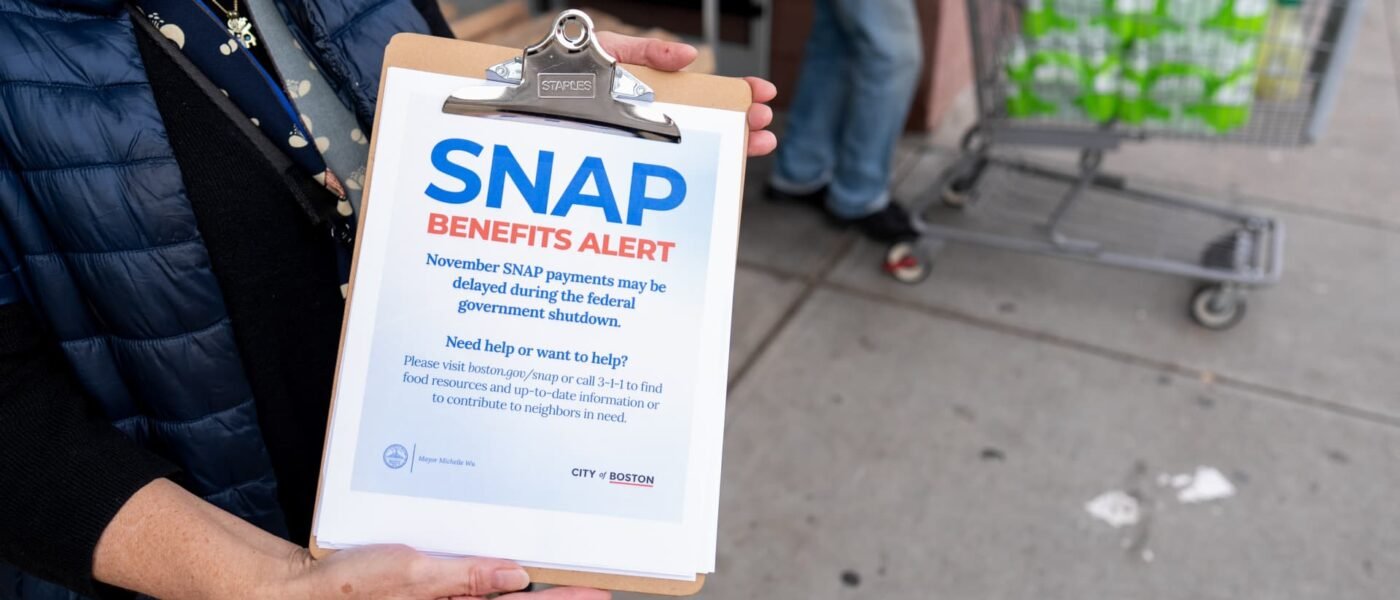 Un voluntario muestra información sobre el Programa de Asistencia Nutricional Suplementaria (SNAP) en una tienda de comestibles en Dorchester, Massachusetts, EE. UU., el lunes 3 de noviembre de 2025.