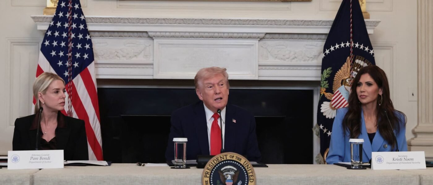 El presidente de Estados Unidos, Donald Trump, junto con la fiscal general de Estados Unidos, Pam Bondi, y la secretaria de Seguridad Nacional de Estados Unidos, Kristi Noem, participan en una mesa redonda sobre «Antifa», un movimiento antifascista que designó como «organización terrorista» nacional mediante una orden ejecutiva el 22 de septiembre, en la Casa Blanca en Washington, DC, el 8 de octubre de 2025.